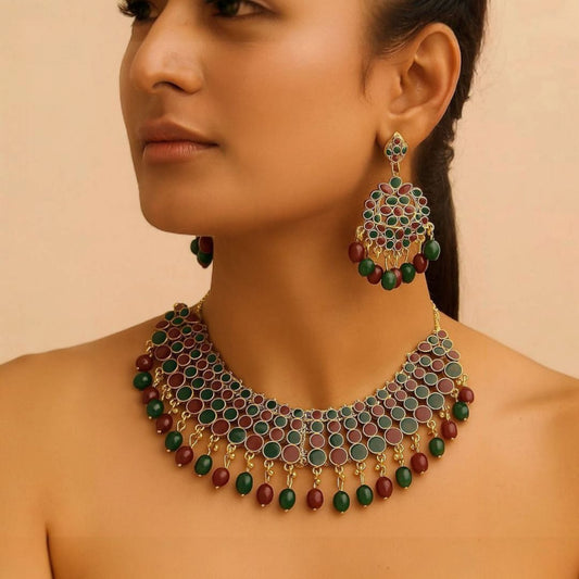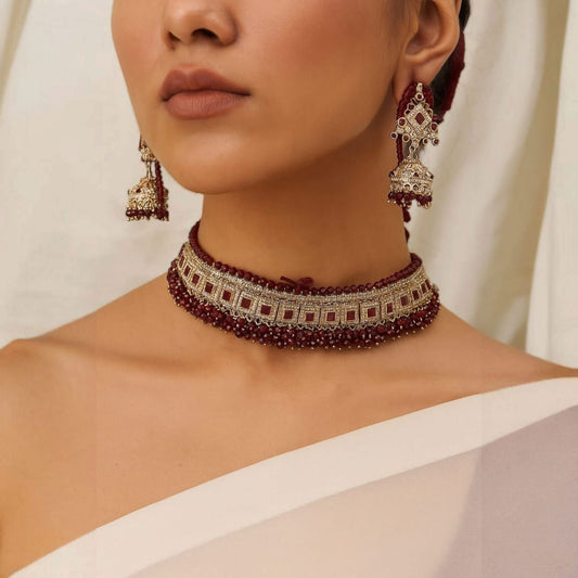 Adorn yourself with the exquisite Red Zercon Choker Set, where vibrant crimson meets crystalline brilliance....