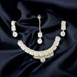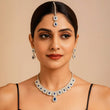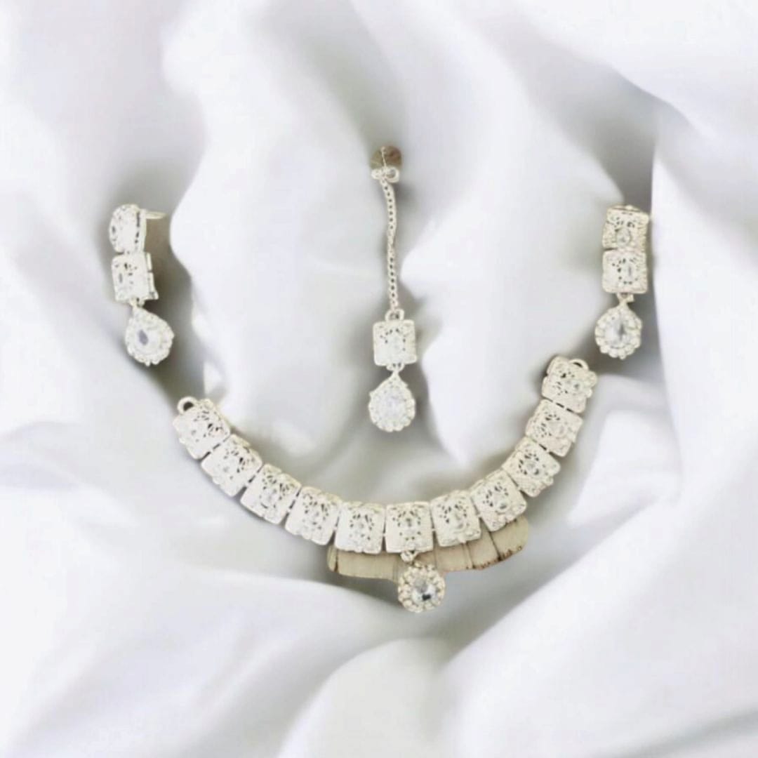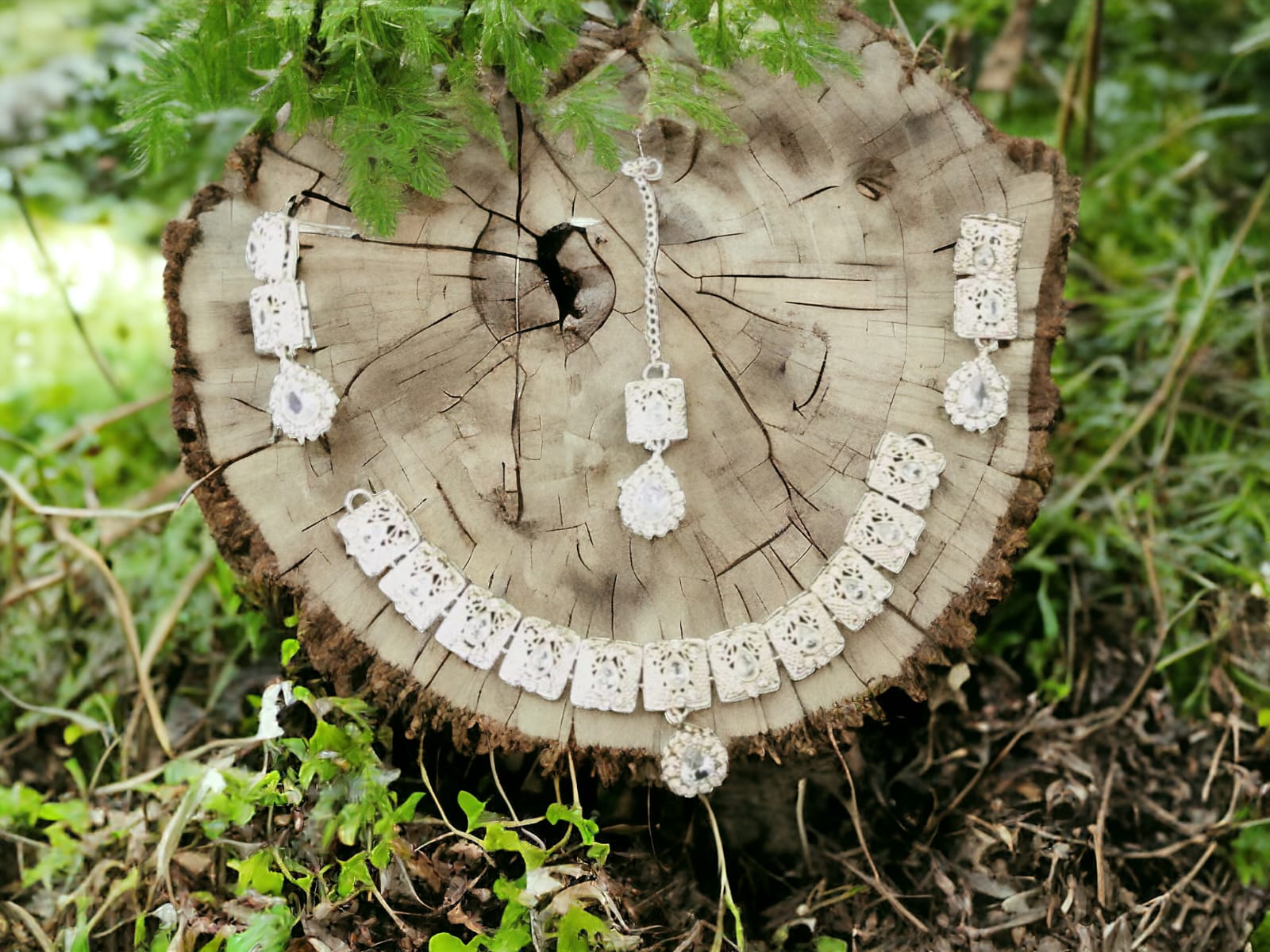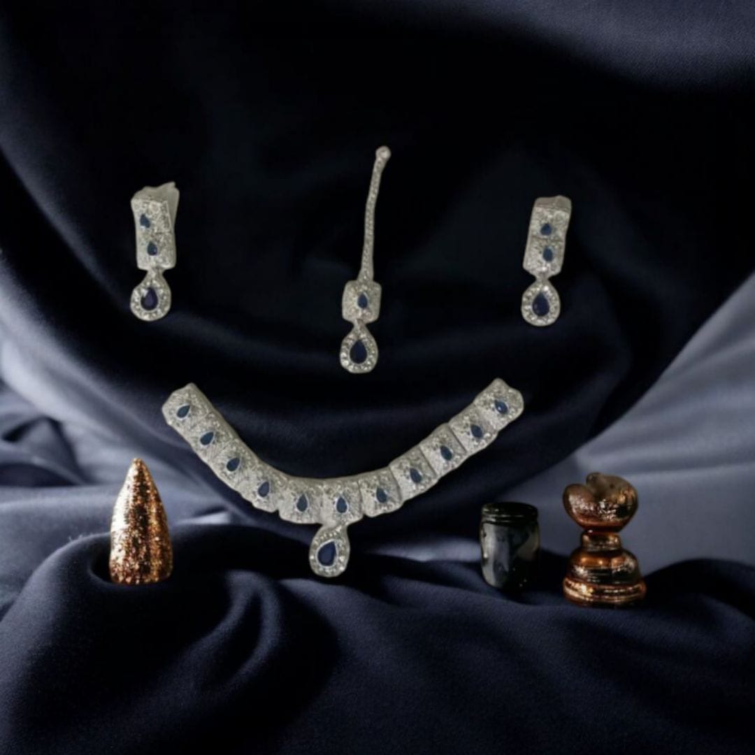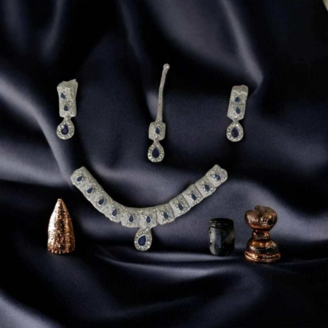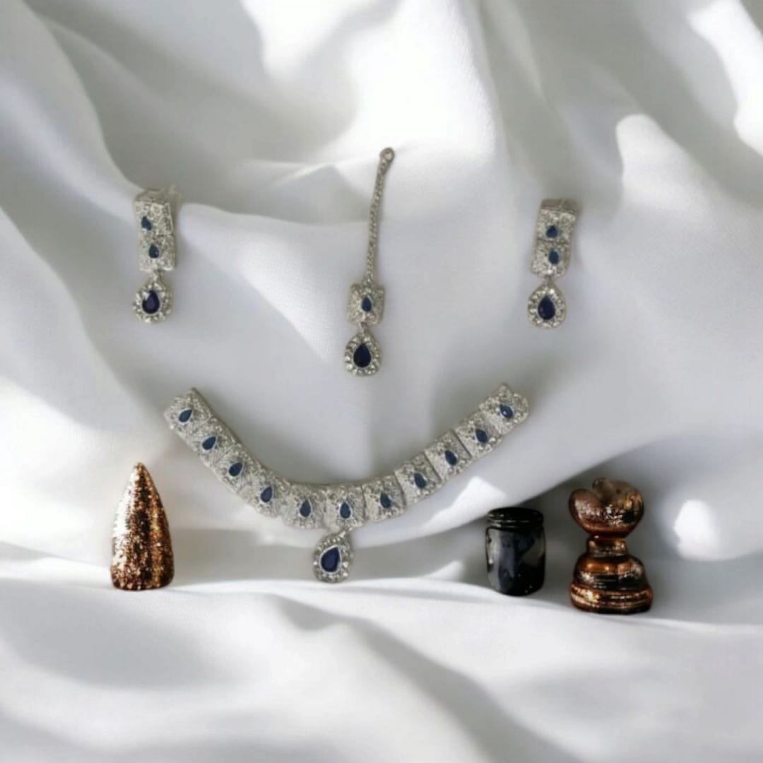 This set includes a stunning silver choker adorned with blue gemstones, adding a touch of sophistication to any outfit.